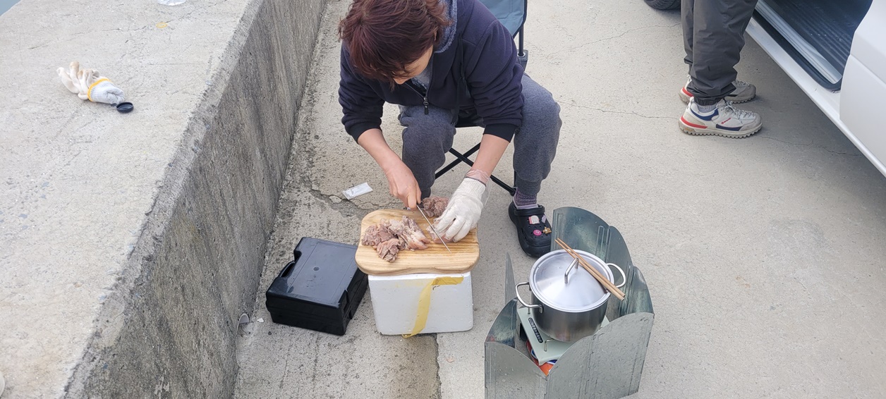 근디 고기가 없다..야들이 지렁이 반응이 아예 없어서 낚시는 접어 두고 아침 준비를 한다.