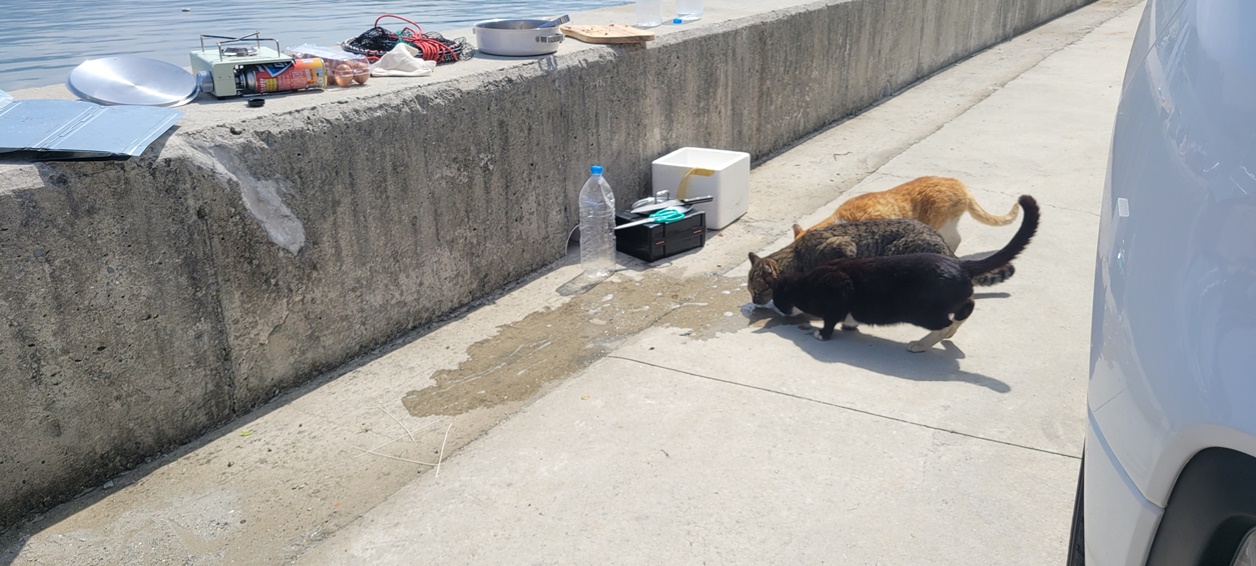 수육삶은 국물에 고양이들이 고개를 쳐 박고 먹는다..