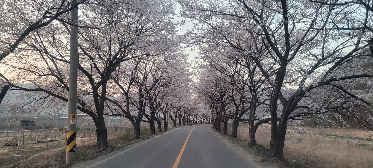 우리는 고속도로에서 내려서 창녕~각북으로 해서 가창으로 넘어갈려고 가는길에 각북에 벚꽃이 이쁘게 피어 있다..